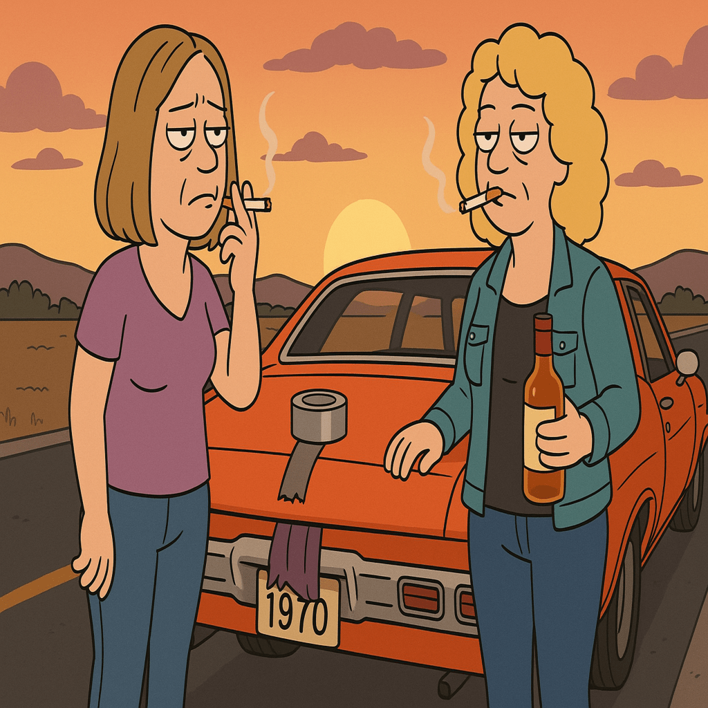 Sippin’ cheap whiskey under busted stars.
